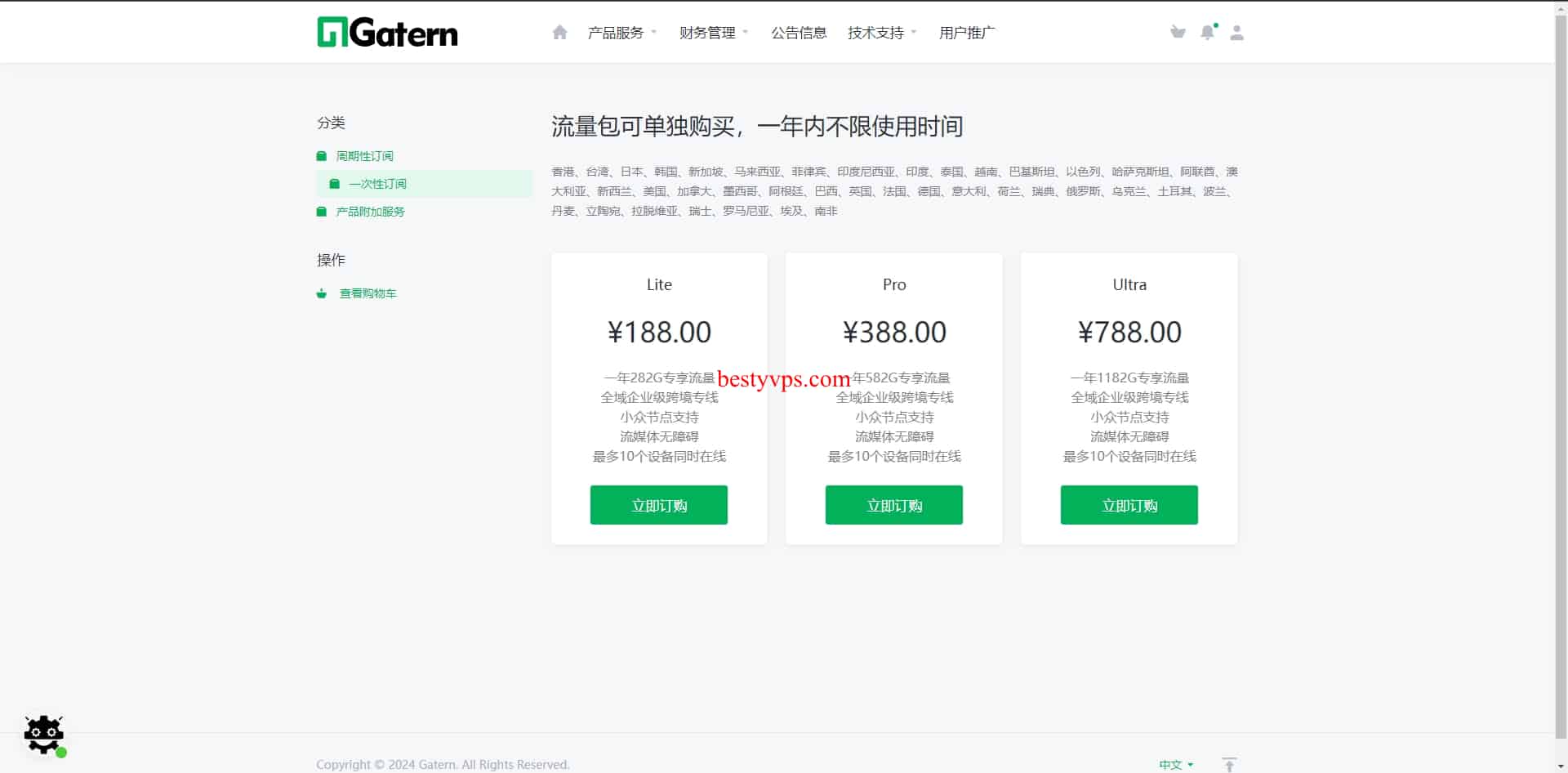 Gatern提供多种套餐选择,从Nano套餐的100GB月流量到Large套餐的1460GB月流量不等,价格从24元到292元不等,满足不同用户的需求。此外,还提供150G的流量包,适用于轻度翻墙用户。